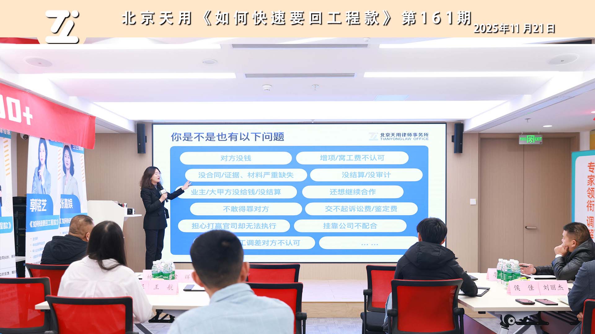 为了更好地帮助建工老板找到回款的清晰路径,2025年11月21日下午,北京天用律师事务所如期举办了第163期《如何快速要回工程款》专题讲座!本次讲座采用 “线下主场+线上直播” 的联动模式。来自全国各地的十几位建工老板亲自来到北京天用律所参与本次讲座,共同破解工程款拖欠困局!