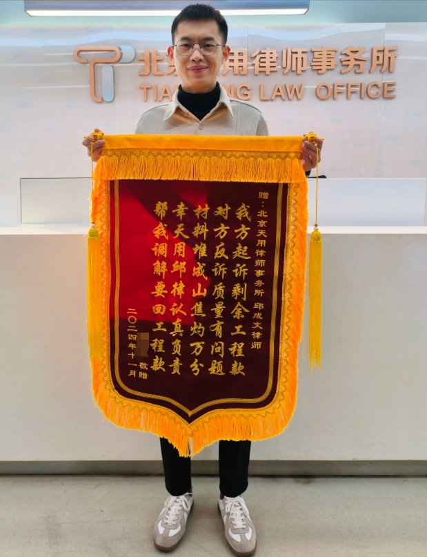 天用律所荣获客户赠送“我方起诉剩余工程款......帮我调解要回工程款”锦旗