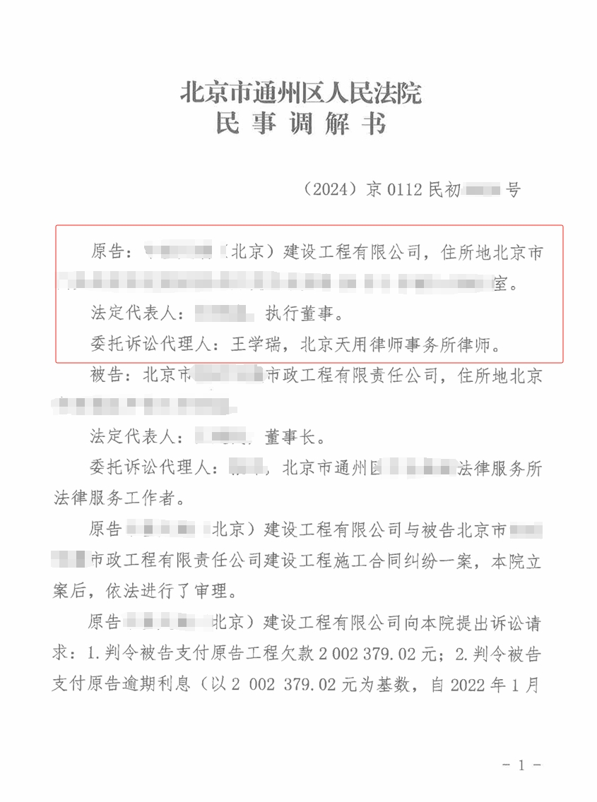 在庭审中,天用律师表达了和解意愿,努力促使双方达成和解,不仅维护了当事人的合法权益,也维护了双方后期继续友好合作的关系,一举双赢。案件由法院出具调解书,市政工程公司向北京建设工程公司支付工程款及税金共计214万余元。