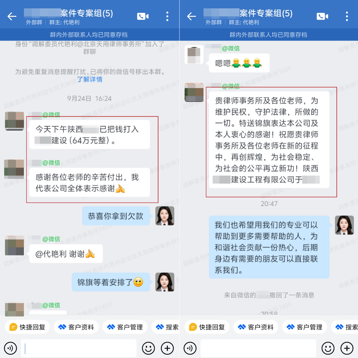 当于先生顺利收到这笔追讨数年的工程款时,他深感欣慰与感激,对天用律师给予了极高的赞扬,特意送来一面锦旗表达感谢!