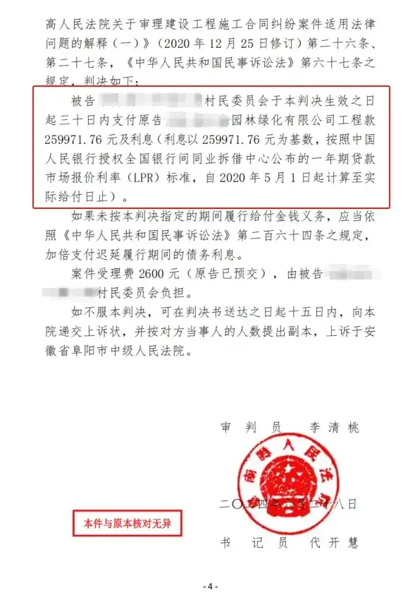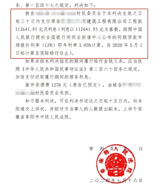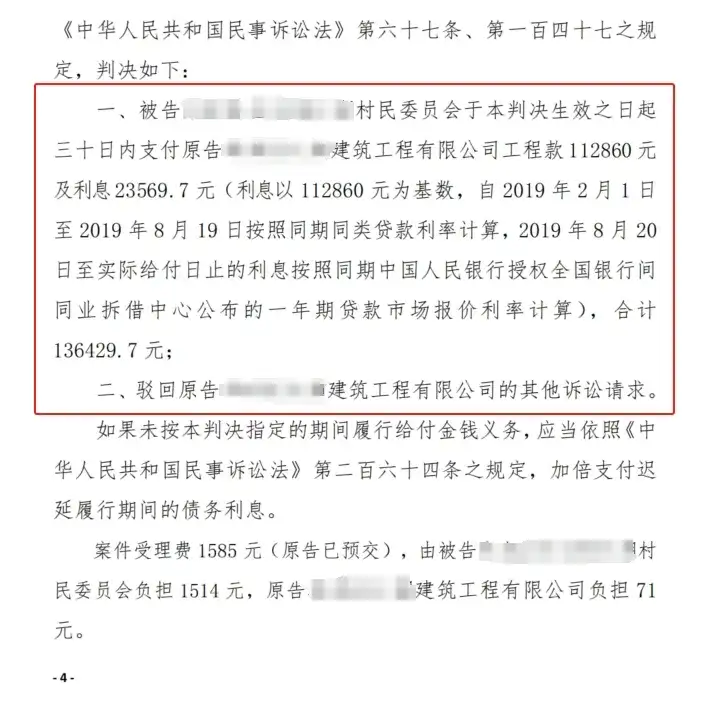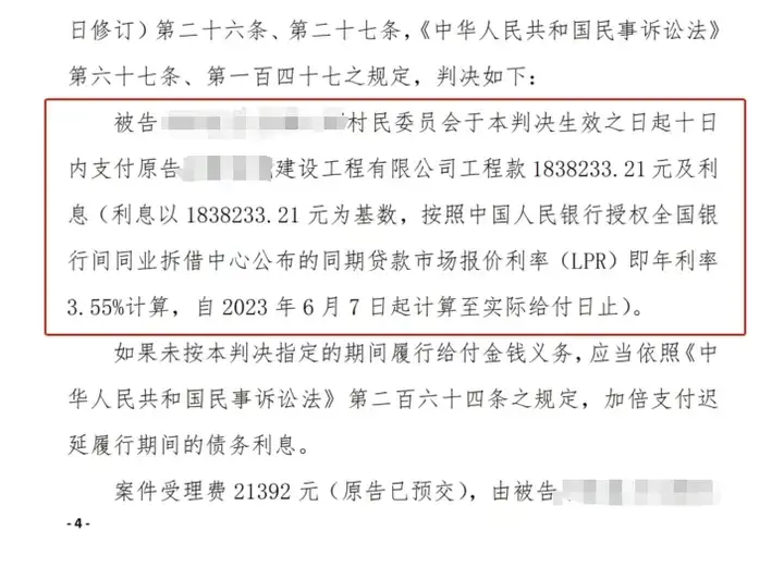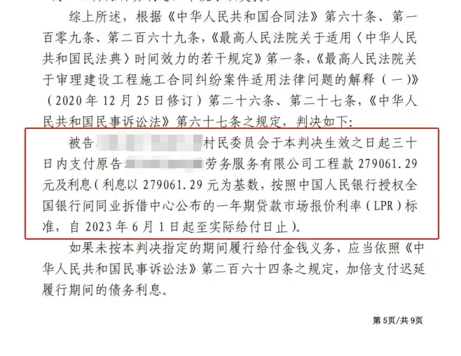 法院判决村委会需在判决生效之日起十日内支付我方当事人全部工程款263万元以及按照同期贷款市场报价利率计算的逾期利息。