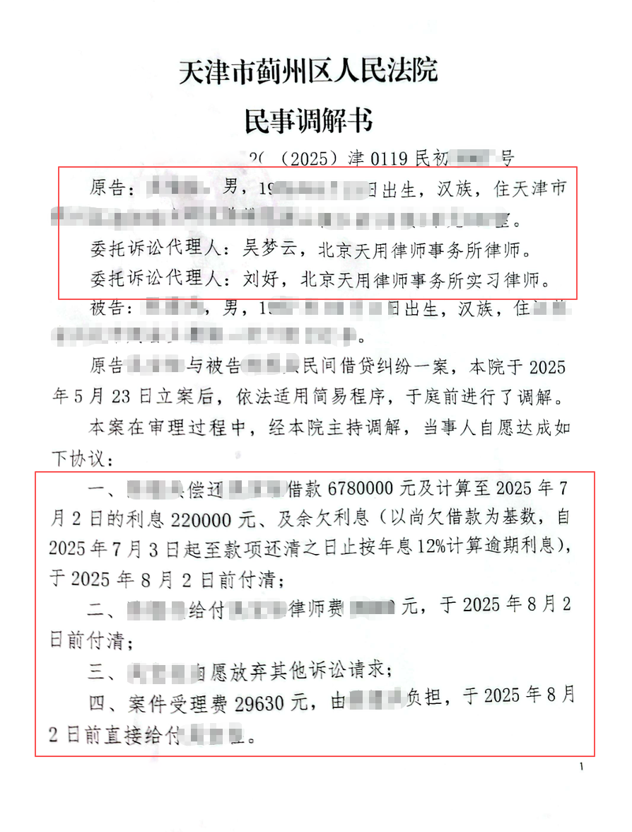 在天用律师万全的准备之下,庭审过程非常顺利,仅用了30分钟的时间,陈某当庭认可了欠款的事实与金额,双方达成了调解,陈某归还吴先生借款以及利息合计700万元,并承担了诉讼费以及律师费。