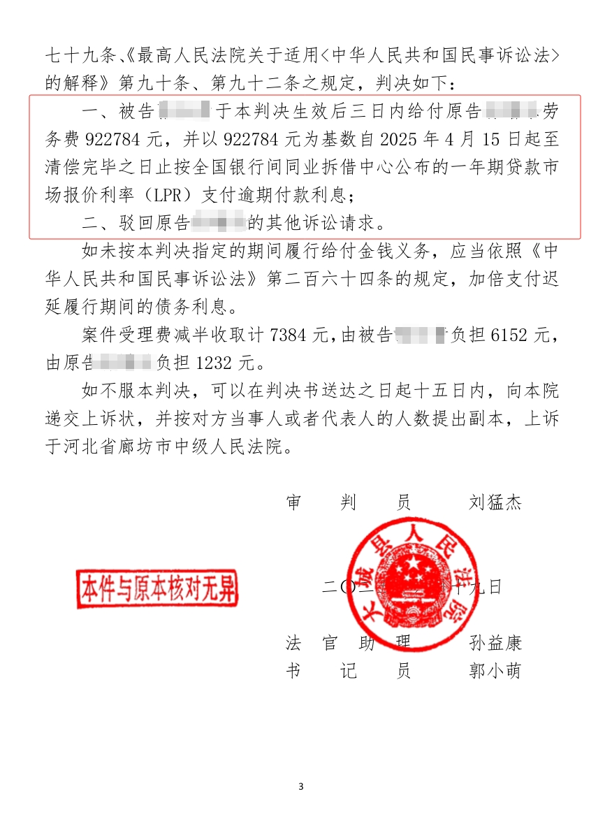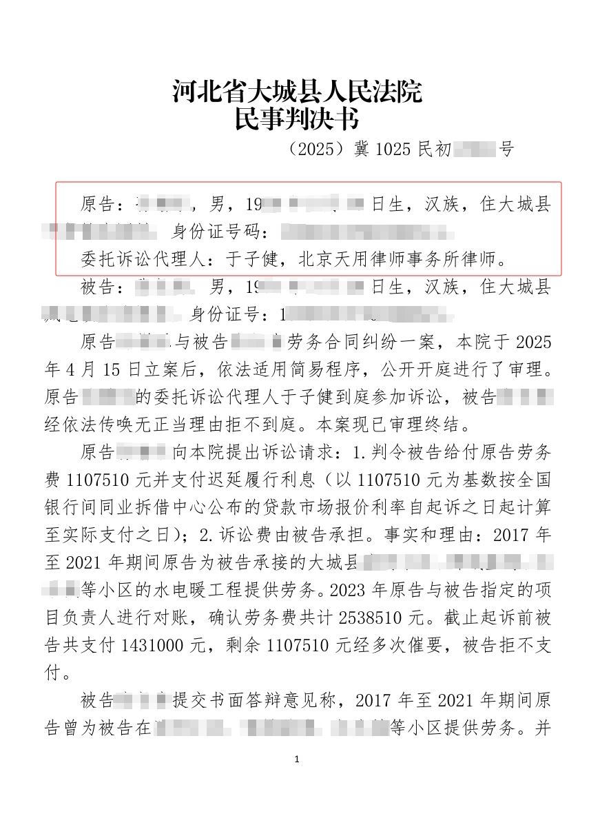 最终一审法院判决张某支付孙先生劳务费92万余元,并支持了利息。孙先生对天用律师的专业能力与办案结果高度认可!要账难题,天用律师专打硬仗!