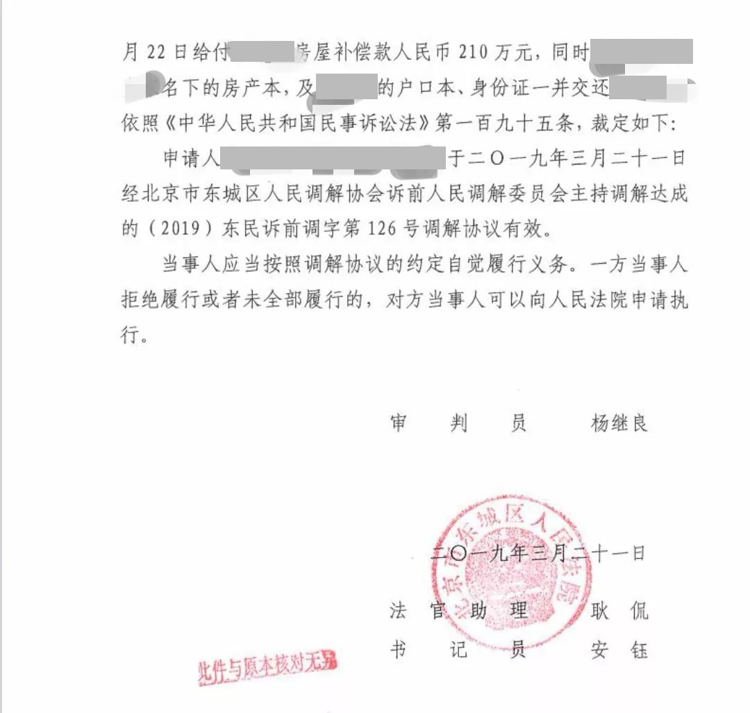 考虑到第二天再支付房屋折价款的风险性,完全不利于保障郭先生的利益,作为郭先生的代理律师——北京天用律师事务所律师向法官提出请求,要求第二天等被告支付完毕所有房屋折价款后,再由法官分发盖章的调解书。若被告未按时支付,则调解书作废。