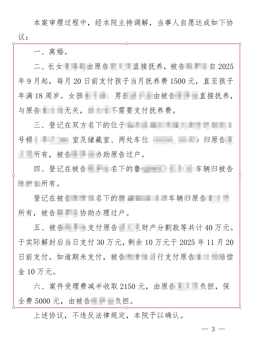 最终达成所愿,双方达成一致调解意见:双方离婚;大女儿归文先生抚养,女方支付抚养费;房产以及储藏室、两处车位、车辆归文先生所有;女方还需支付文先生财产分割款合计40万元。