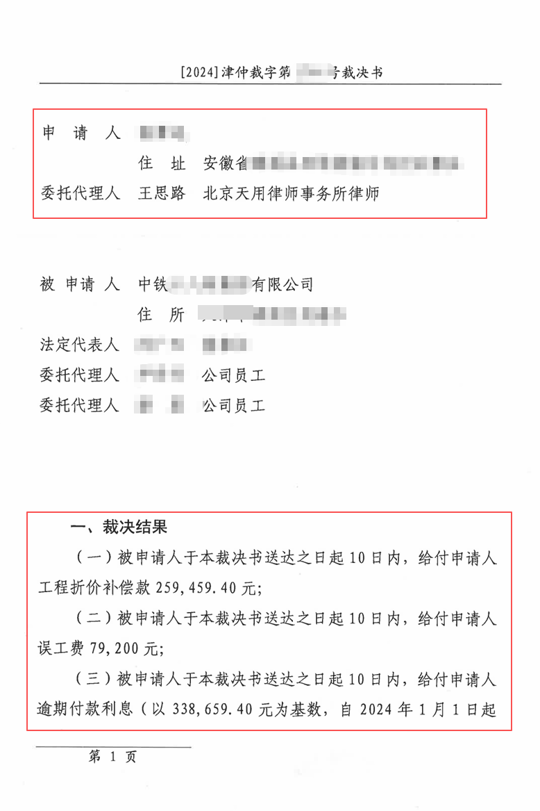 天用律师的专业陈述和扎实证据得到了仲裁庭的高度认可。最终,仲裁庭裁决支持了张先生的大部分诉求,判决中铁某局向张先生支付工程折价补偿款26万元、全额误工费近8万元以及相应的逾期付款利息,总计回款34万余元。这一结果不仅为张先生要回了工程款,更关键的是,通过仲裁裁决解决了问题,避免了与央企的正面“冲突”,张先生对天用律师在如此短时间内,通过专业策略取得决定性胜利表示万分感激,特意送来锦旗盛赞天用律师!