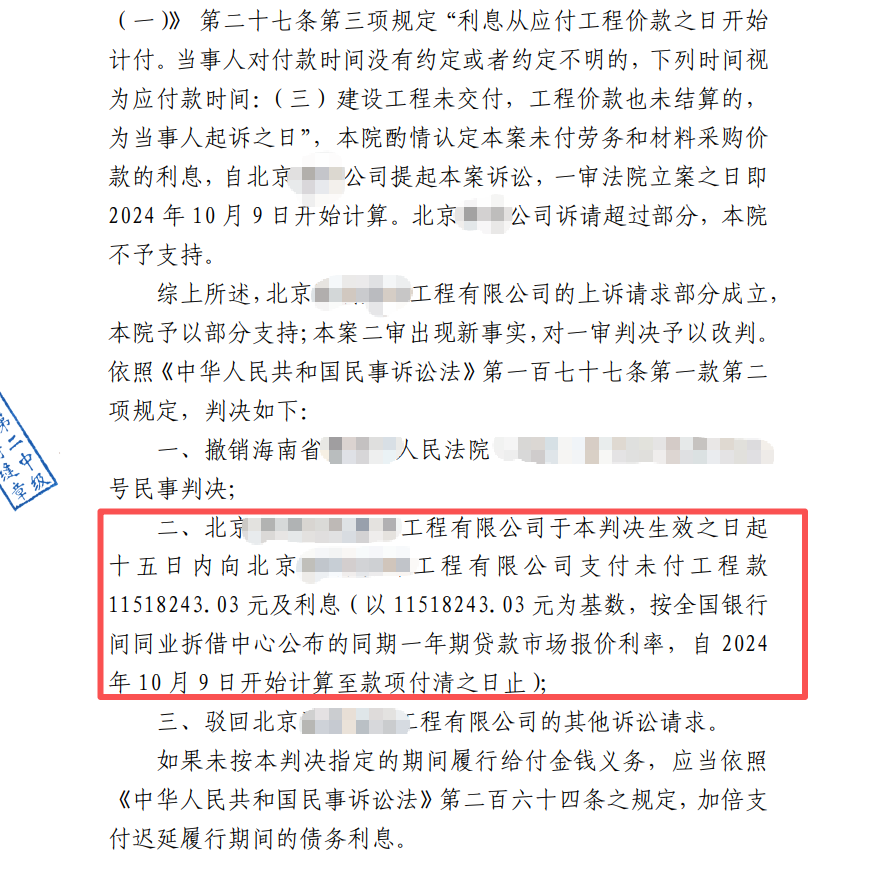 二审法院完全采纳了天用律师的代理意见,撤销一审判决;判令建筑公司支付工程款1151万余元及利息(自2024年10月起计算);诉讼费主要由建筑公司承担。