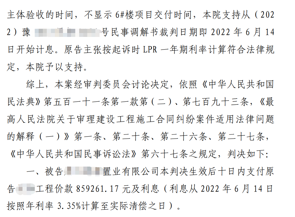 经过多次开庭审理,法院最终采纳了天用律师的主张,判决开发商支付工程款859,261.17元,并自2022年6月14日起按年利率3.35%计算利息,直至款项付清为止。案件受理费、鉴定费和保全费也全部由开发商承担。