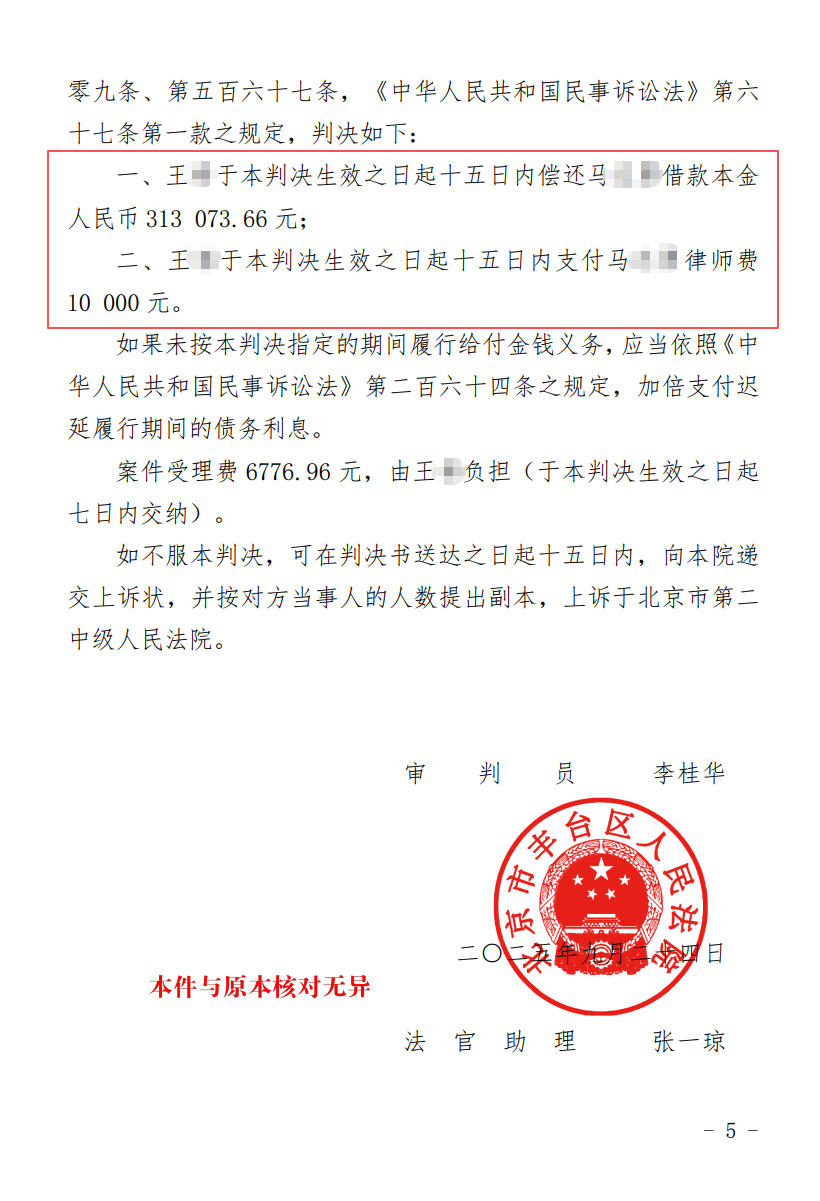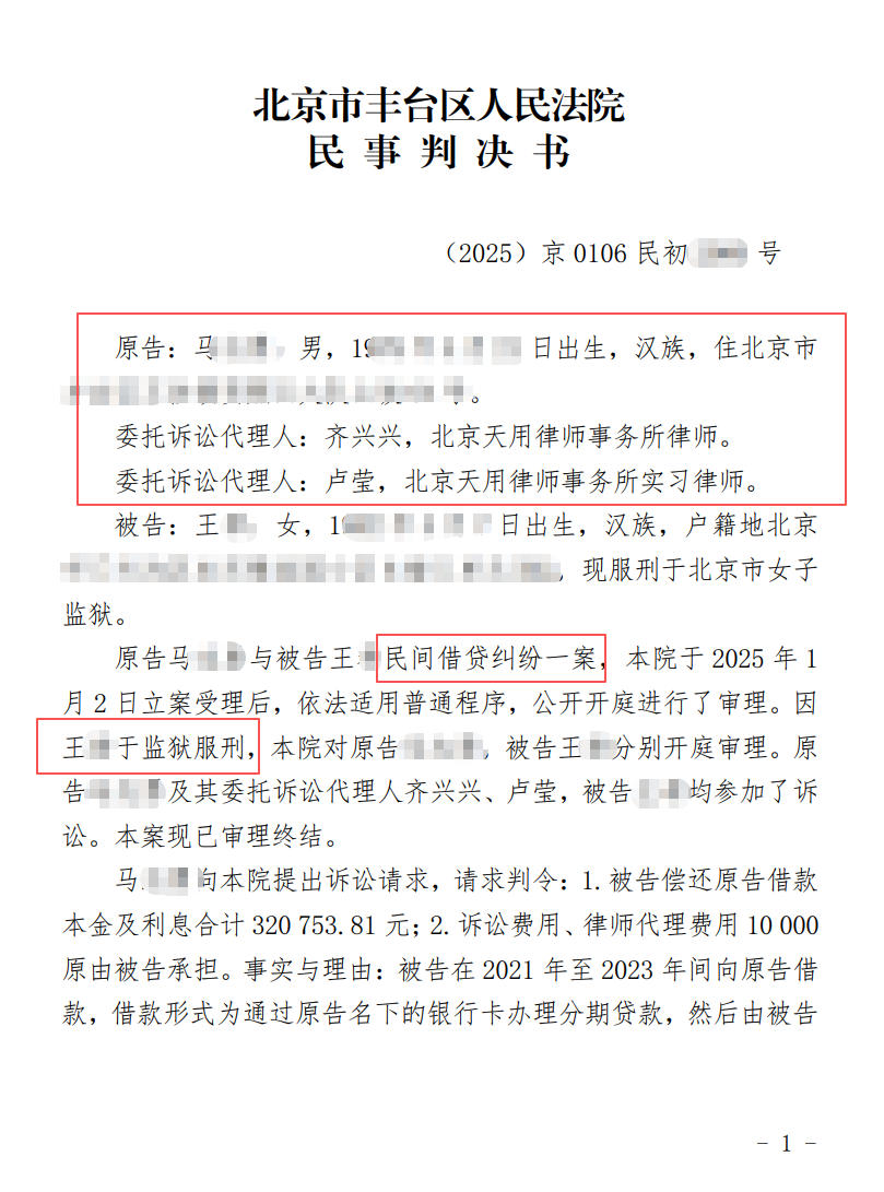 最终,法院完全采纳了天用律师的代理意见,一审判决王某偿还马先生借款本金人民币31万余元,并承担马先生为此案支付的律师费。