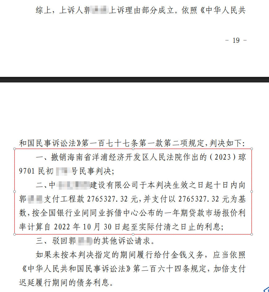 对于一审判决的金额,天用律师认为没有实现委托人权益最大化,于是整理资料进行上诉。在二审期间,天用律师转变庭审思路,全力与法官争取,二审成功改判,判决中某建设公司支付郭先生工程款约277万元以及利息。