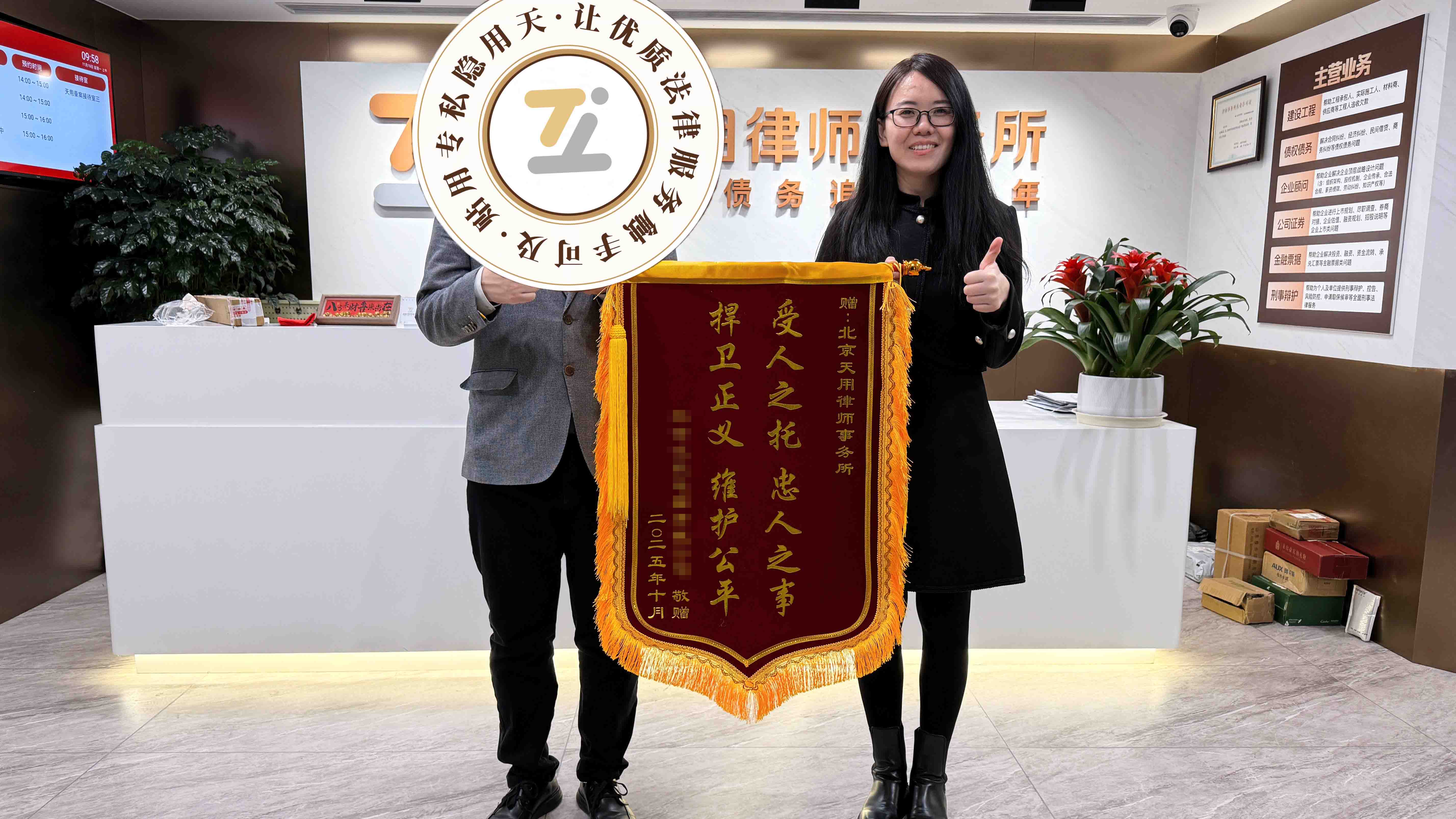 工程公司对天用律师的专业能力赞不绝口,特意送来“一级造价 一级建造 一级团队 一级判决”的锦旗!