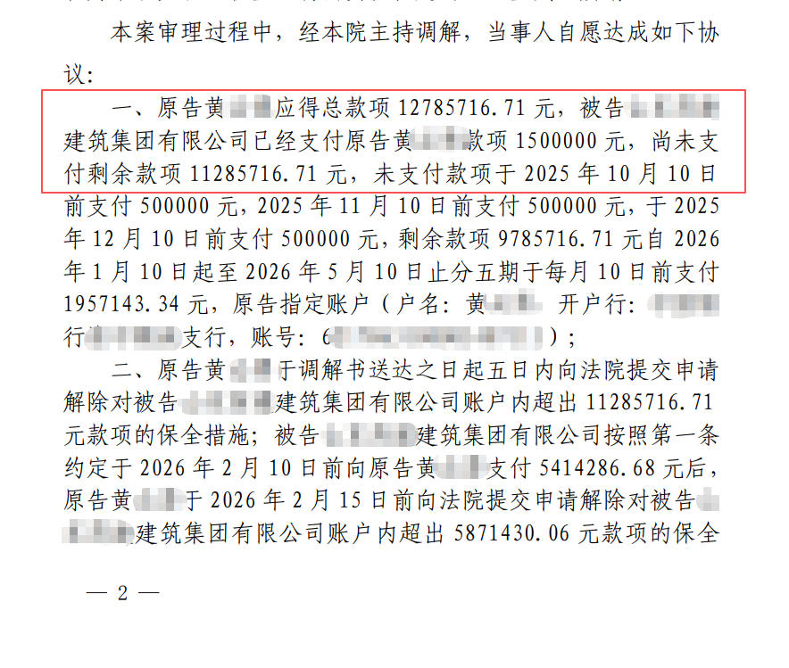 最终,法院出具了民事调解书,确认被告分五期支付剩余款项1100多万元,并约定逾期履行可申请强制执行,极大降低了黄先生回款的风险。